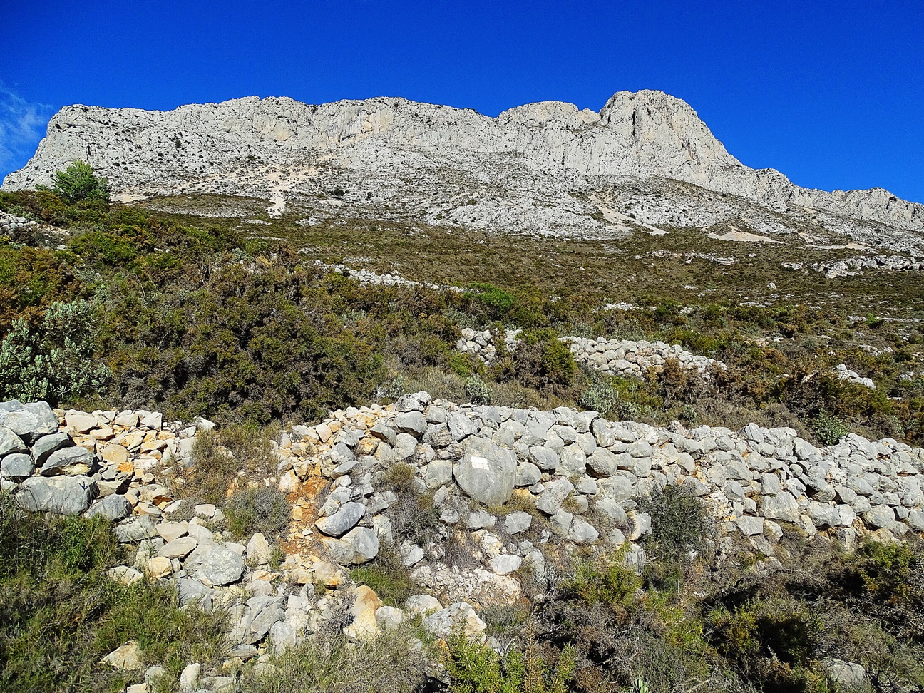 En lo más alto la cima de Bernia y en primer plano restos de antiguos bancales...